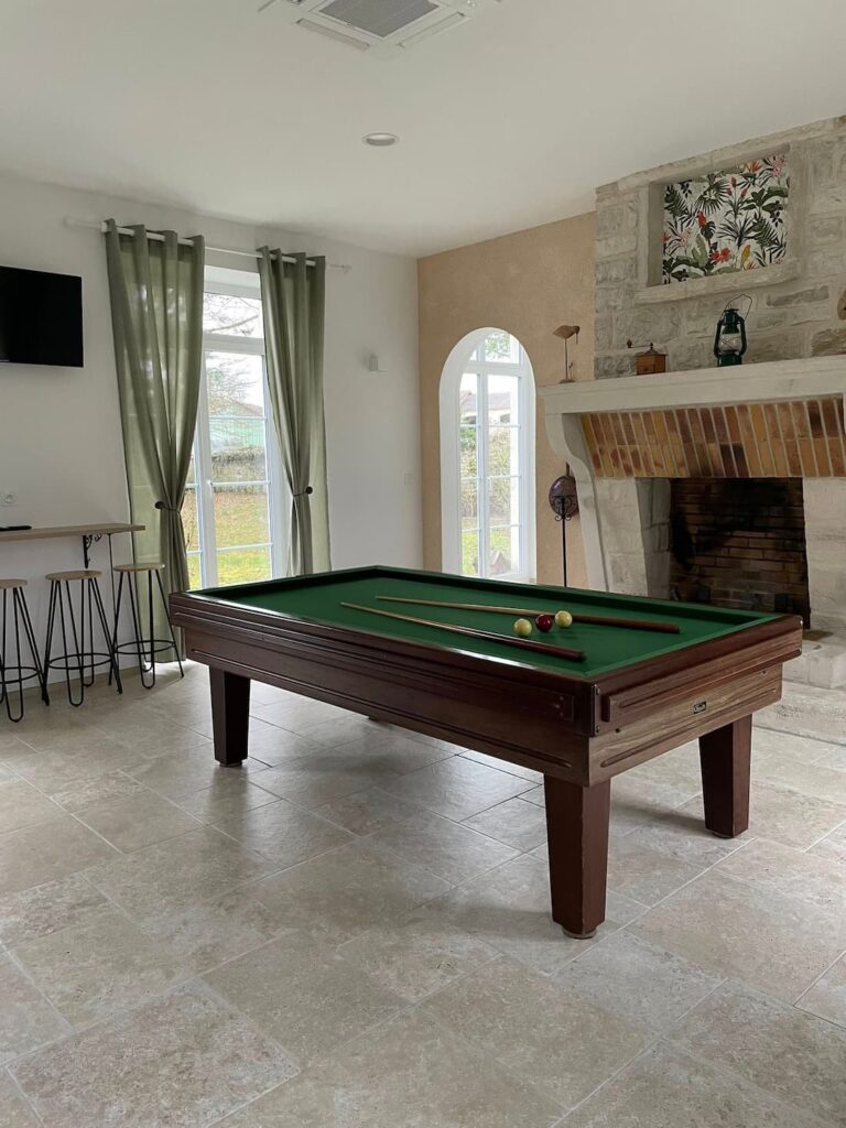 Rez-de-chaussée : pièce de vie avec coin repas et salon, cuisine équipée, salle d’eau, WC indépendant et salle de billard pour prolonger les soirées.